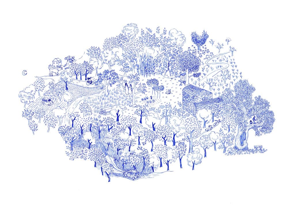 Cette carte est réalisée par Emma Stévenot, illustratrice, qui a commencé à poser ses premiers traits à l’encre noire. Ses dessins évolueront peu à peu pour donner naissance à une œuvre plus collective.
